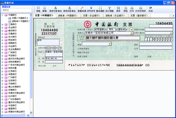 一彩支票打印软件,为用户提供银行支票、银行进账单、结算业务申请书、业务委托书、电汇凭证、承兑汇票、托收凭证、现金存款单、贷记凭证、付款凭证、同城业务支付凭证、现金缴款单以及各种快递单等等打印功能。